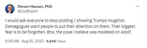 Yesterday the world waited for Mr. TFG’s mugshot to be released. I will not share it here. Dr. Steven Hassan, an expert on cults and mind control, warned against sharing the mugshot in a recent X/Twitter post, pointing out that widely promoting the image is what autocrats like Mr. TFG want. He even went as far to describe Mr. TFG’s “pose . . . [as] modeled on Adolf.”
