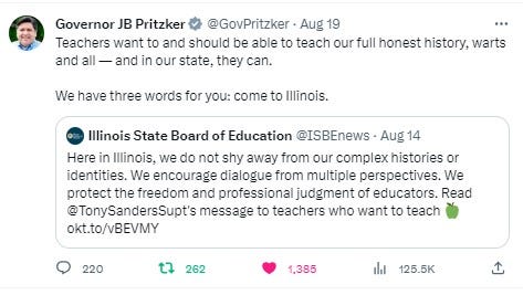 Again. Illinois remained aware and resisted. On August 14, The74 published Illinois Superintendent of Education Tony Sanders’s op-ed inviting Florida teachers to relocate to Illinois. Pritzker echoed this five days later on X/Twitter.