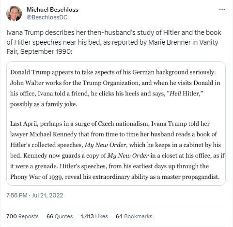 Make no mistake that when Mr. TFG said he “loves the poorly educated,” he knew what that meant and what he would do once elected U.S. President in 2016. The 1990 Vanity Fair article “After the Gold Rush” revealed not only the depth of his racism and anti-Semitism but that even then Mr. TFG believed in “The Big Lie.” The article’s author Marie Brenner stated that the late and first Mrs. TFG told her lawyer that Mr. TFG read and stored a copy of Hitler’s speeches “in a cabinet by his bed.”