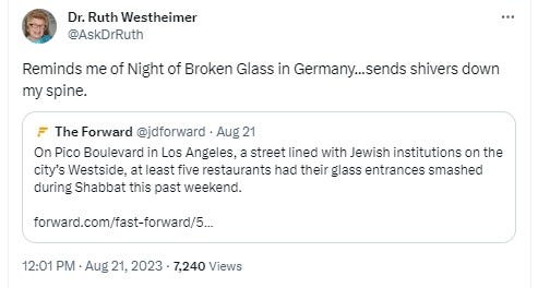 Terrorism against the marginalized occurred early this summer too. For example, back in June, anti-Semitic flyers were dropped in Sacramento, CA neighborhoods. Last Sunday, The Forward reported that over Jewish Sabbat, several kosher Jewish restaurants were attacked. Holocaust-survivor Dr. Ruth Westheimer responded to the news on X/Twitter.